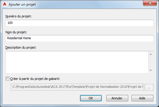 Remarque : Vous ne pouvez pas définir tous les fichiers de prise en charge et les chemins d'accès directement lorsque vous créez un projet. Vous pouvez uniquement définir le nom, le numéro, la description et le gabarit du projet. Les autres propriétés sont définies une fois le projet créé. Si vous créez le projet d'après un gabarit, ses propriétés font office de paramètres initiaux. Si vous créez un projet sans utiliser de gabarit, les propriétés sont vides au départ ou définies par les options de projet AEC par défaut.