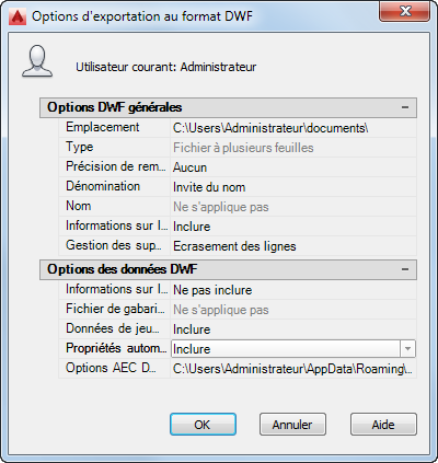 • Cliquez sur ExporterOptions DWF/PDF.