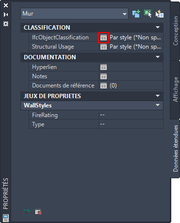 - Dans la palette des propriétés, dans l'onglet Données étendues, sous le groupe de fonctions Classification, cliquez sur IfcObjectClassification et sélectionnez la classification.