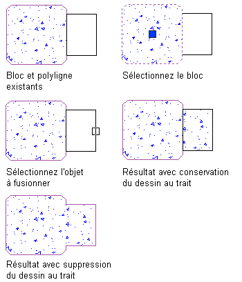 Cette procédure permet de fusionner des polylignes fermées, des cercles, des hachures, des polygones AEC, des extrusions de masses élémentaires, des espaces ou des blocs contigus avec une entité de dessin au trait ou un objet à contour fermé.