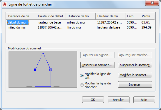 Le tableau figurant dans la partie supérieure de la boîte de dialogue affiche les informations relatives à chaque sommet du mur-rideau. Mais vous pouvez aussi choisir le sommet à modifier dans la liste.