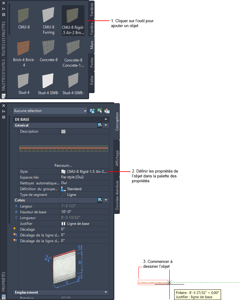 Remarque : Certaines valeurs peuvent être définies uniquement lors de l'insertion de l'objet. Par exemple, la position d'une porte le long du mur ne peut être définie qu'au moment de son insertion. Il n'est pas possible de changer ultérieurement la position d'une porte existante. Les valeurs qui ne peuvent être définies qu'à l'insertion sont repérées par le symbole