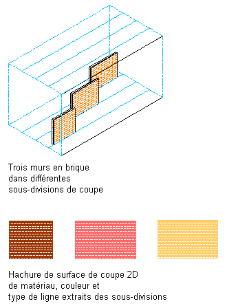 Lorsque vous créez des sous-divisions au niveau du style, les objets qu'elles contiennent se distinguent généralement de ceux d'autres sous-divisions. Lorsque vous associez des matériaux aux objets, paramétrez le style de coupe 2D de sorte qu'il utilise le motif de hachures du matériau, mais la couleur et le type de ligne des propriétés d'affichage de la sous-division.
