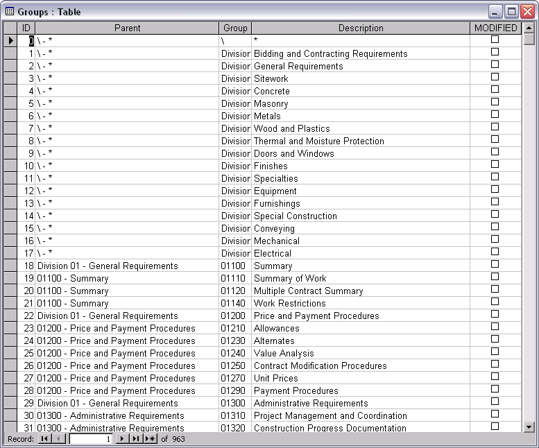 La table Groups définit la structure hiérarchique des notes d'identification au sein de la base de données. Cette hiérarchie détermine l'ordre dans lequel les divisions, les groupes, les sous-groupes et les notes d'identification individuelles s'affichent dans l'Editeur des notes d'identification, dans la boîte de dialogue Sélectionner la note d'identification et dans les légendes des notes d'identification. Les champs suivants s'appliquent à chacune des rangées de la table :