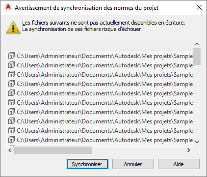 Si certains dessins de projet ne sont actuellement pas en état d'être synchronisés, vous recevez le message d'avertissement suivant :