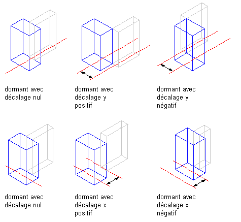 | Y | Dans une vue en plan, un décalage Y positif déplace le bord du dormant au-dessus de la ligne de base, tandis qu'un décalage Y négatif le déplace au-dessous de cette ligne. |