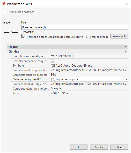 - Les outils de ligne de coupure doivent disposer d'éléments de prise en charge dans le dessin contenant le symbole de ligne de coupure. Comme dans le cas des outils à plusieurs composants tels que les étiquettes de nomenclature, leur modification ultérieure en sera simplifiée. Toutes les propriétés des symboles de coupe sont définies dans les propriétés d'outils, que les symboles de coupe masquent/ajustent ou non les objets.