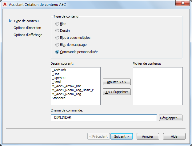 - Utilisez l'Assistant Création de contenu AEC afin de créer des outils pour les cotes AutoCAD standard. Ainsi, à l'aide de l'option Commande personnalisée et des identificateurs de calques, vous pourrez vérifier que les cotes sont placées sur le calque adéquat.