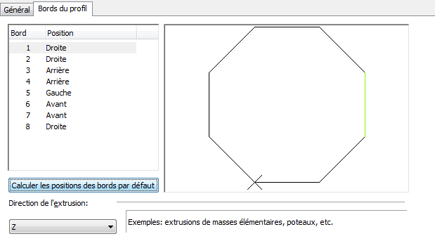Lorsque vous créez un profil, tous les bords sont marqués pour une extrusion dans la direction Z. Les positions des bords sont calculées en fonction du quadrant sur lequel repose le point médian du bord. Vous pouvez changer la direction de visualisation des bords et la direction d'extrusion dans la définition du profil.