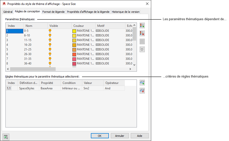 Les styles de thèmes d'affichage permettent de définir un thème d'affichage particulier pour l'insertion de données non graphiques dans un dessin en mettant en évidence les objets qui répondent aux critères spécifiés. Le type de mise en évidence est contrôlé par le biais d'un ou de plusieurs paramètres thématiques, chacun d'entre eux spécifiant une couleur de remplissage, des hachures ou un type de ligne précis. Pour chaque paramètre thématique, il existe une ou plusieurs règles thématiques déterminant les objets qui seront mis en évidence à l'aide du paramètre utilisé.