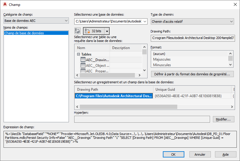 - Dans la liste déroulante Catégorie de champ, sélectionnez Projet AEC.