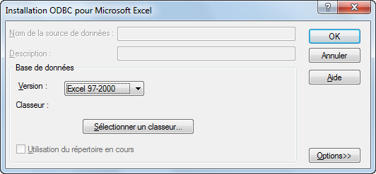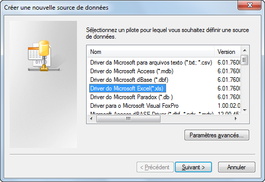 - Dans la boîte de dialogue Créer une nouvelle source de données, sélectionnez Pilote Microsoft Excel (*.xls).
