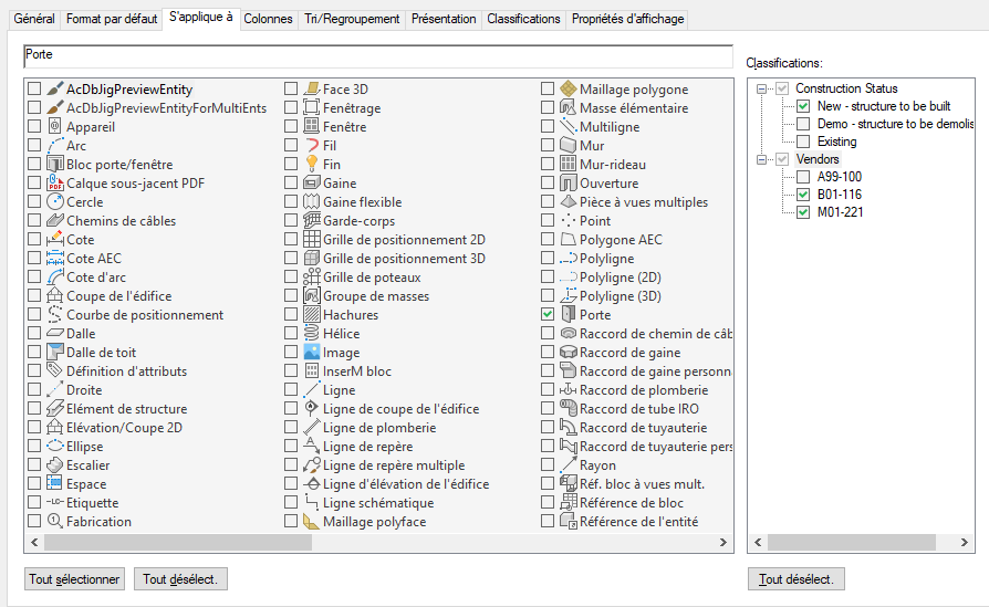 Toutes les définitions de classifications s'appliquant aux mêmes objets auxquels la définition de jeu s'applique sont affichées dans la partie droite accompagnées de la liste des classifications. Si des classifications ont été sélectionnées, la définition de jeu de propriétés ne peut être appliquée qu'aux objets ou styles et aux définitions sélectionnés dans la partie gauche et dont toutes les classifications ont été sélectionnées dans la partie droite.