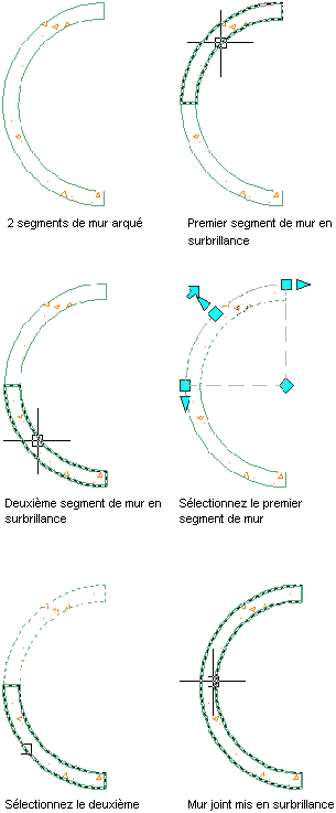L'illustration suivante représente deux segments de mur courbés qui sont joints après la mise en surbrillance de chacun d'entre eux.