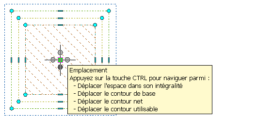 | déplacer le contour utilisable de l'espace | cliquez sur la poignée d'emplacement et, tout en maintenant le bouton de la souris enfoncé, appuyez à trois reprises sur la touche Ctrl pour basculer en mode Déplacer le contour utilisable. Déplacez ensuite le contour utilisable jusqu'à l'endroit souhaité et cliquez pour valider sa position. |