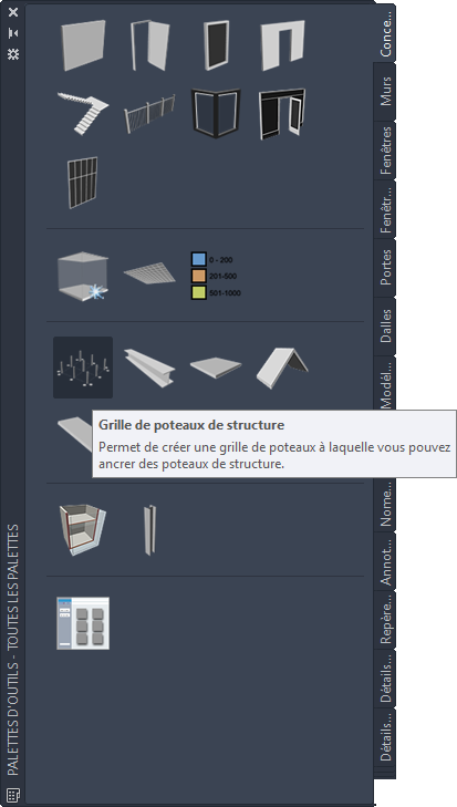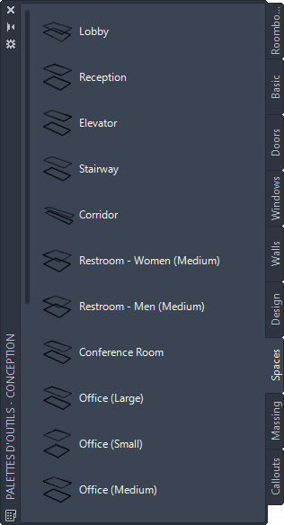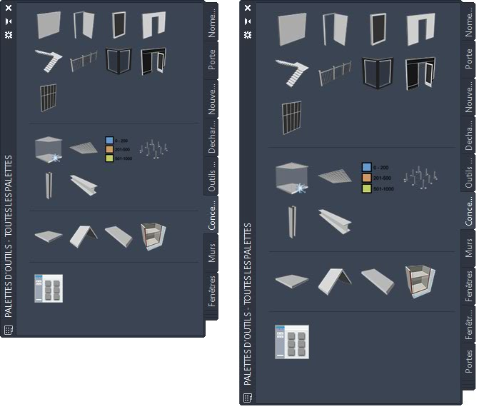 L'affichage du jeu de palettes d'outils varie selon les paramètres appliqués à l'ensemble des jeux de palettes d'outils et aux palettes d'outils individuelles. Dans le jeu de palettes d'outils, définissez la transparence, la taille, la position et l'option de masquage automatique pour le jeu de palettes.