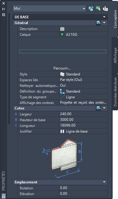 Palette des propriétés d'un objet mur standard.