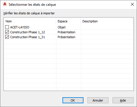6. Si vous avez sélectionné un fichier DWG, DWS ou DWT contenant plusieurs états de calque, sélectionnez l'état de calque de votre choix dans la boîte de dialogue Sélectionner les états de calque et cliquez sur OK.