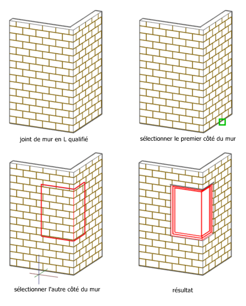 | une fenêtre d'angle dans un mur | sélectionnez une jonction de mur en L qualifiée. Choisissez un point d'insertion dans le second mur. |