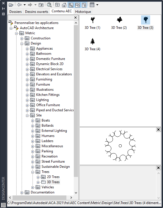 Lorsque vous ouvrez le DesignCenter à partir de la liste déroulante du groupe de fonctions Palettes dans l'onglet Vue, puis cliquez sur l'onglet Contenu AEC, l'arborescence Personnaliser les applications s'affiche dans le volet de gauche avec Jeu d’outils AutoCAD Architecture 2027 comme noeud racine. Sous ce noeud racine, les dossiers métrique et anglo-saxon regroupent différentes catégories, correspondant approximativement aux divisions CSI MasterFormat 2004. Au niveau inférieur de l'arborescence, chaque dossier pointe vers des fichiers de dessin externes, chacun contenant du contenu AEC. Vous pouvez activer ou désactiver l'arborescence en cliquant sur