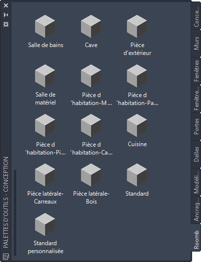 La palette d'outils Roombook contient différents styles de matériaux de surface. Les commandes sont liées au fichier Roombook styles.dwg.
