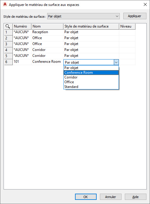 2. Dans la boîte de dialogue Appliquer le matériau de surface aux espaces, choisissez le style voulu et cliquez sur Appliquer.