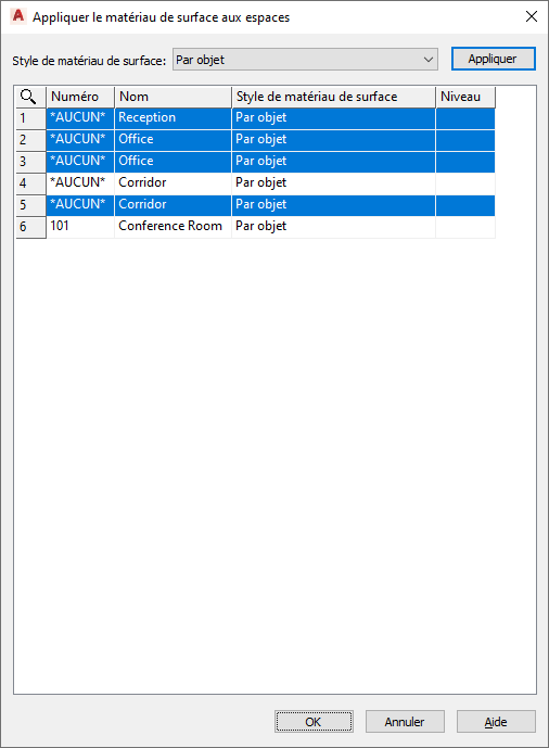 Tous les espaces du dessin sont répertoriés dans la boîte de dialogue, avec des informations sur le numéro, le nom et le niveau. Seules les informations relatives au style de matériau de surface peuvent être modifiées.