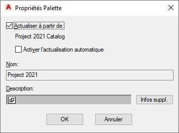 Si vous activez l'option d'actualisation automatique, toute palette d'outils liée est actualisée à chaque démarrage du logiciel, afin de refléter les modifications de la palette d'outils et de son contenu dans le catalogue d'outils.
