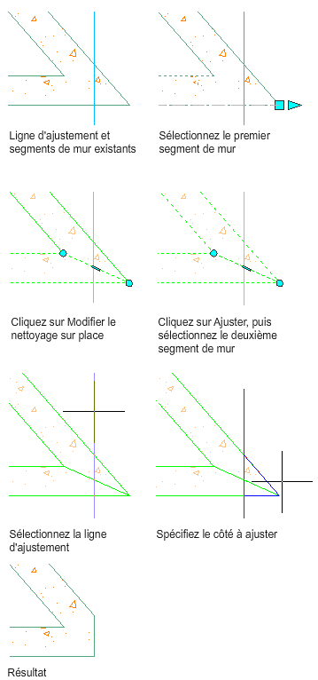 Cette procédure permet de modifier une intersection de mur en ajustant un composant. Le contour d'ajustement peut être une ligne, un arc, un cercle, une polyligne ou le bord d'un composant de mur.