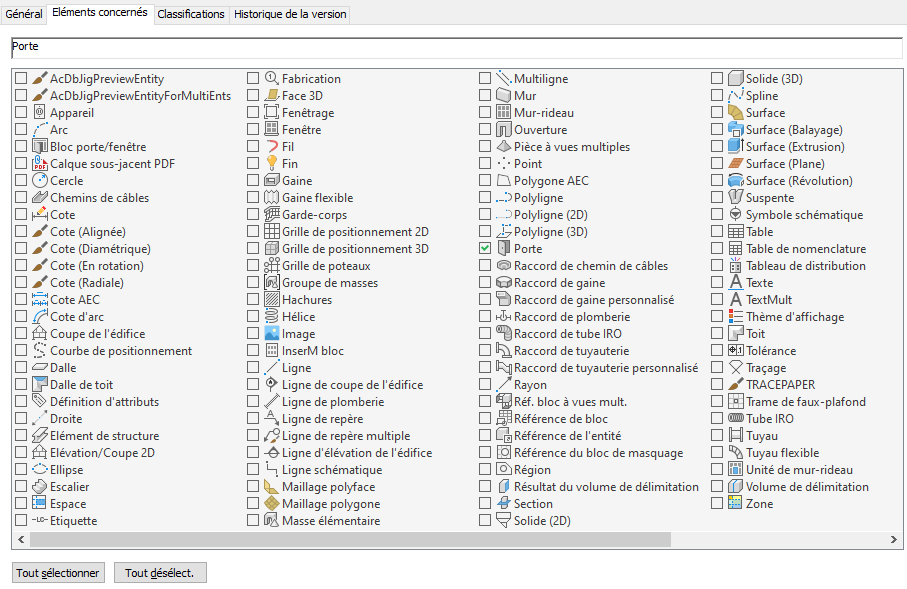 Si, par exemple, vous précisez qu'une définition de classification donnée s'applique à des portes et des fenêtres, la classification est répertoriée dans l'onglet Classification de tous les styles de portes et de fenêtres du dessin. Vous pouvez également sélectionner une classification individuelle pour chaque objet fenêtre et porte dans l'onglet Données étendues de la palette de propriétés.