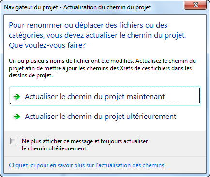 remettre à plus tard la mise à jour de tous les fichiers de projet cliquez sur Actualiser le chemin du projet ultérieurement. Si vous fermez le projet sans avoir actualisé son chemin, les fichiers de dessin demeurent en attente de mise à jour et s'affichent dans la boîte de dialogue File d'attente d'actualisation des chemins du projet lors de la réouverture du projet.