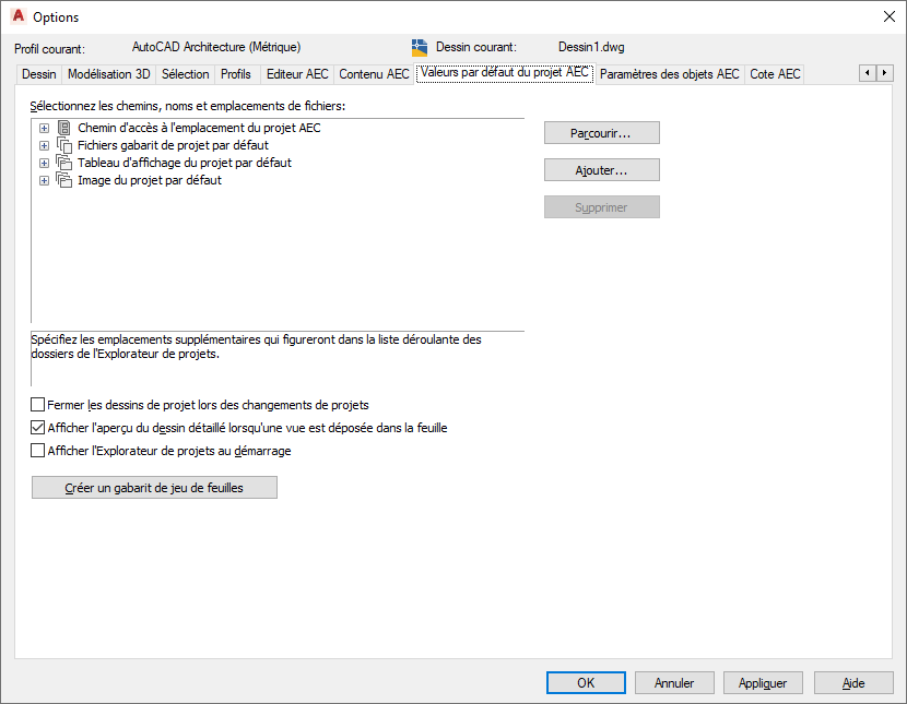 Spécification des options des valeurs par défaut du projet AEC pour le dessin en cours