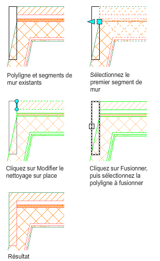 Cette procédure permet de modifier une intersection de mur en fusionnant un profil avec un composant de mur. Le profil peut être n'importe quelle zone délimitée par une polyligne qui chevauche ou coïncide avec le composant.