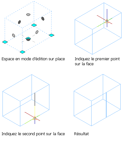 Vous pouvez fractionner une surface d'un espace 3D de forme libre. Cette fonction permet de modifier la géométrie d'une portion d'une surface de l'espace, par exemple pour créer une poutre en U afin d'introduire un câble dans le plafond d'un espace.
