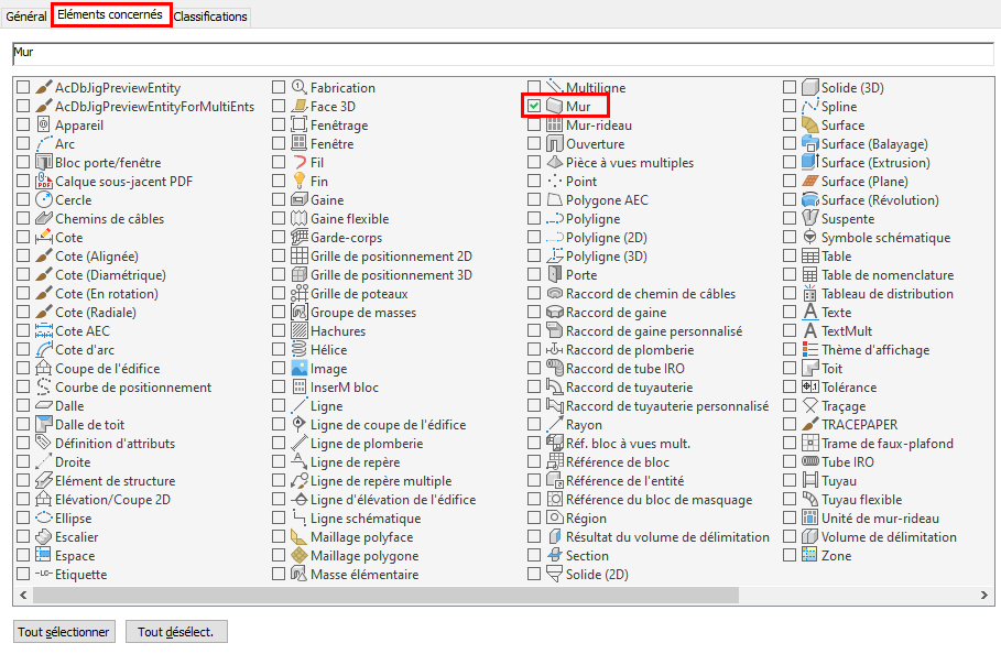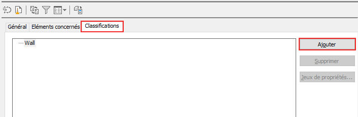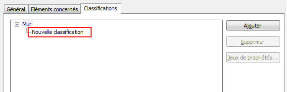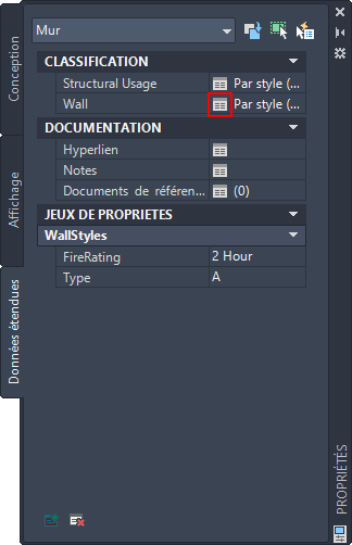 - Dans l'onglet Données étendues de la palette des propriétés, sous Classification, cliquez sur le bouton en regard de Mur.
