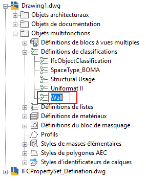 Jeu d’outils AutoCAD Architecture 2027 prend en charge les définitions de classifications qui permettent de classifier les styles et les objets. Les processus d'exportation et d'importation dans IFC prennent en charge ces classifications affectées aux styles et aux objets.