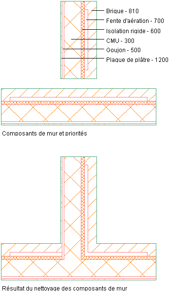 Le nettoyage des murs comportant plusieurs composants est basé sur les priorités affectées à chaque composant ainsi qu'à leur emplacement à l'intérieur du mur. Les bords des composants correspondants de même priorité sont étendus ou ajustés sur leurs points d'intersection. Les composants de priorité élevée (numéro de priorité inférieur) passent avant les composants de priorité faible (numéro de priorité supérieur).