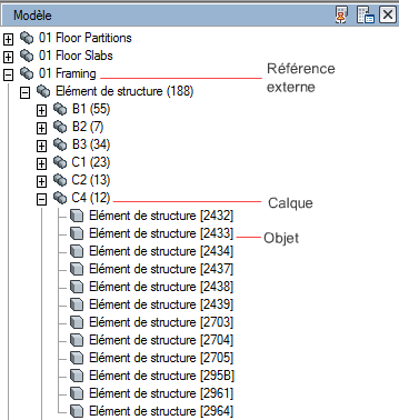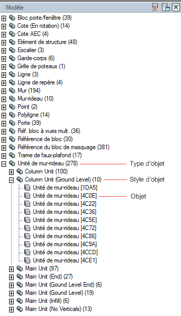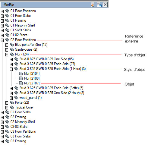 Comme le montre l'exemple suivant, lors de l'exportation vers un fichier DWF, DWFx, ou PDF des données de jeux de propriétés incluses dans un fichier DWG, vous pouvez indiquer la manière dont les données doivent être organisées. Cela peut faciliter l'exportation de projets de grande taille qui possèdent de nombreuses propriétés d'objets.