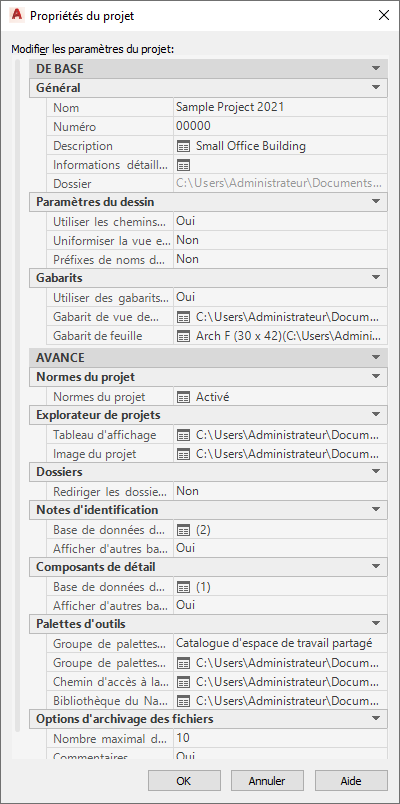 | Nouveau projet basé sur le projet de gabarit Jeu d’outils AutoCAD Architecture 2027 par défaut | Renvoie à un nouveau fichier ATC sous \<Nom du projet>\Standards\ WorkspaceToolPalettes\ <Nom du projet>.atc. Par défaut, une palette d'outils vide figure déjà dans ATC. |