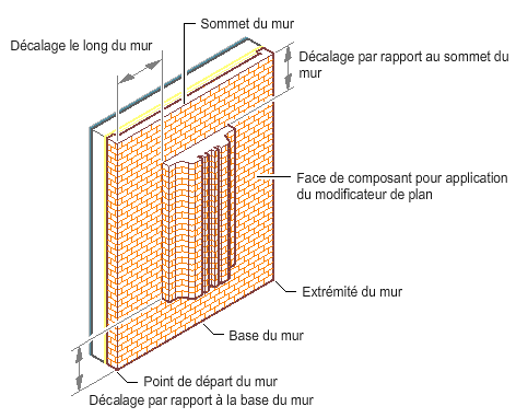 | spécifier la hauteur de fin du modificateur de mur | entrez une valeur dans le champ Décalage par rapport au sommet (du mur), puis indiquez si le décalage se produit à partir du haut du mur, de la hauteur de base du mur, de la ligne de justification du mur ou du bas du mur. |