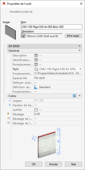 Le style de mur lui-même est le seul style basé sur des murs que vous pouvez affecter à un outil de palette. Néanmoins, lorsque vous utilisez le style de mur, les sous-styles qui lui sont associés, comme les styles d'extrémités de murs et les styles d'extrémités d'ouvertures de murs, sont automatiquement importés avec lui. Par ailleurs, il existe certaines propriétés d'outil qu'il est préférable de définir par défaut avant d'enregistrer l'outil dans un catalogue :