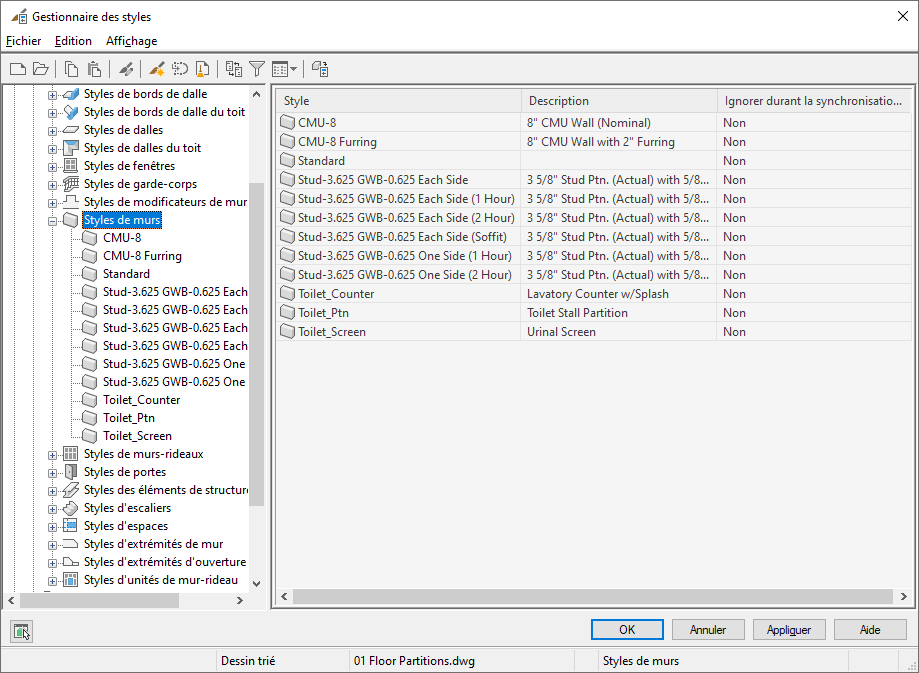 Le Gestionnaire des styles est un utilitaire d'Jeu d’outils AutoCAD Architecture 2027 qui constitue un emplacement central permettant d'afficher et d'utiliser les styles qui déterminent l'apparence et la fonction des objets dans les dessins.