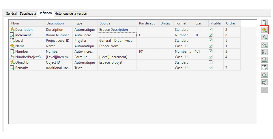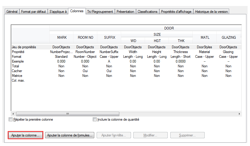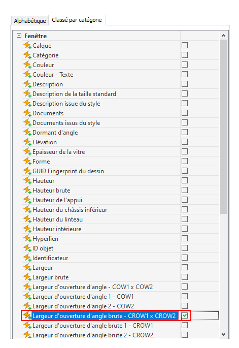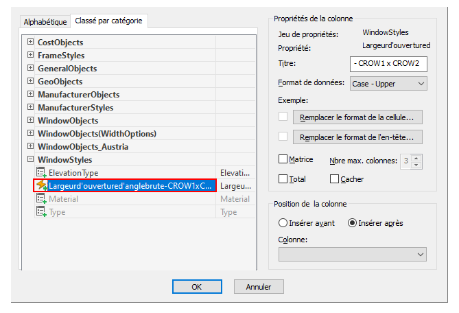 Pour modifier les propriétés automatiques générées dans la nomenclature de la fenêtre, effectuez les opérations suivantes :