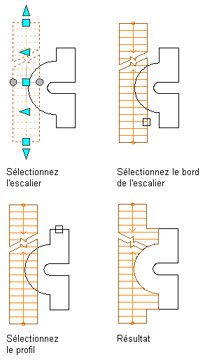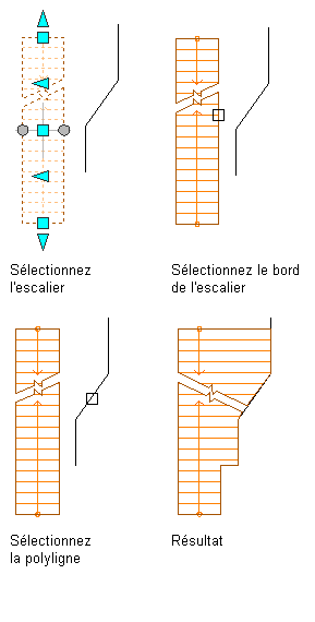 Cette procédure permet de projeter le côté d'un escalier sur une polyligne, un mur, une forme solide ou un objet AEC existant. Les objets vers lesquels s'opère la projection doivent s'étendre sur toute la longueur de l'escalier pour obtenir une bonne projection d'un angle interne.