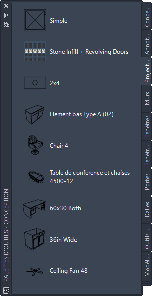 Une fois ajoutée au jeu de palettes d'outils, la palette continue de faire partie du jeu et disponible chaque fois que vous démarrez Jeu d’outils AutoCAD Architecture 2027.