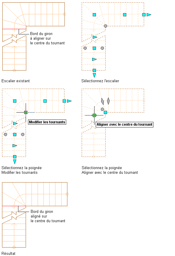 - Sélectionnez la poignée permettant d'aligner le giron par rapport au centre du tournant.
