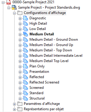La fonction Normes du projet permet aux utilisateurs d'établir, de gérer et de synchroniser les paramètres d'affichage dans l'ensemble d'un projet Jeu d’outils AutoCAD Architecture 2027 project. Vous pouvez définir les paramètres d'affichage aux normes à utiliser dans tous les dessins d'un projet donné.