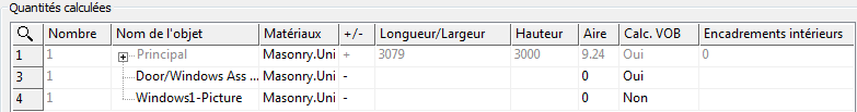 C'est le cas par exemple lorsque des fenêtres et portes adjacentes forment une unité et doivent être calculées en tant qu'unité. Pour modifier les règles de calcul de manière globale, définissez les paramètres de calcul et recalculez les quantités par pièce.