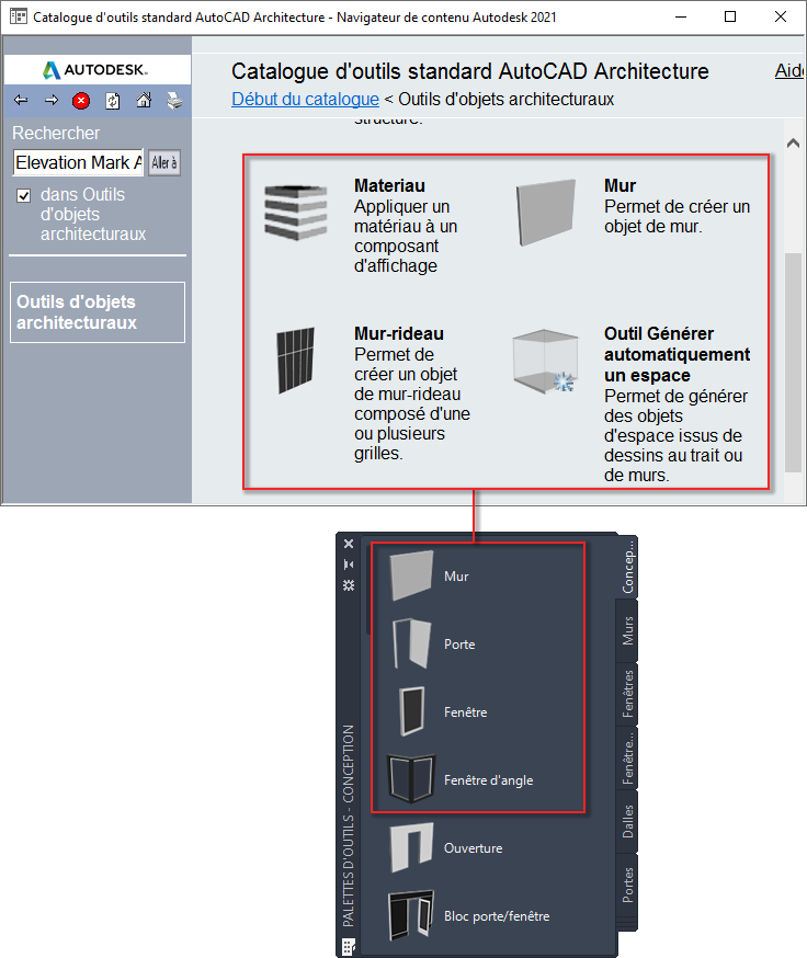 Cette procédure permet de lier un outil à partir d'un catalogue dans le Navigateur de contenu à une palette d'outils dans Jeu d’outils AutoCAD Architecture 2027.