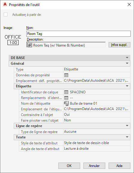 Vous pouvez également sélectionner l'outil dans la palette d'outils, cliquer avec le bouton droit de la souris, puis choisir Propriétés. Sélectionnez ensuite Actualiser à partir de la fiche de travail des propriétés.